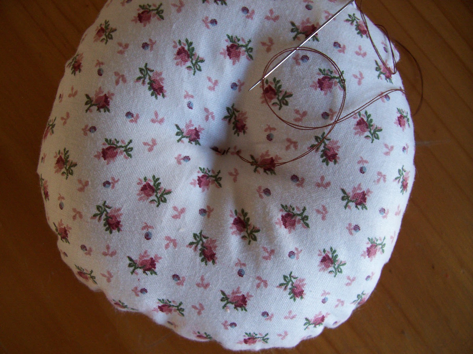 I knot the two ends of the embroidery thread under the button when finished and using a needle I then pull the excess end through the pinchushion and bring it out somewhere on one of the edges and cut it off (this is just to leave some thread inside the pinchushion rather than cutting it off close to where I've tied it and risk it coming undone.  And there you have it...a pinchusion....